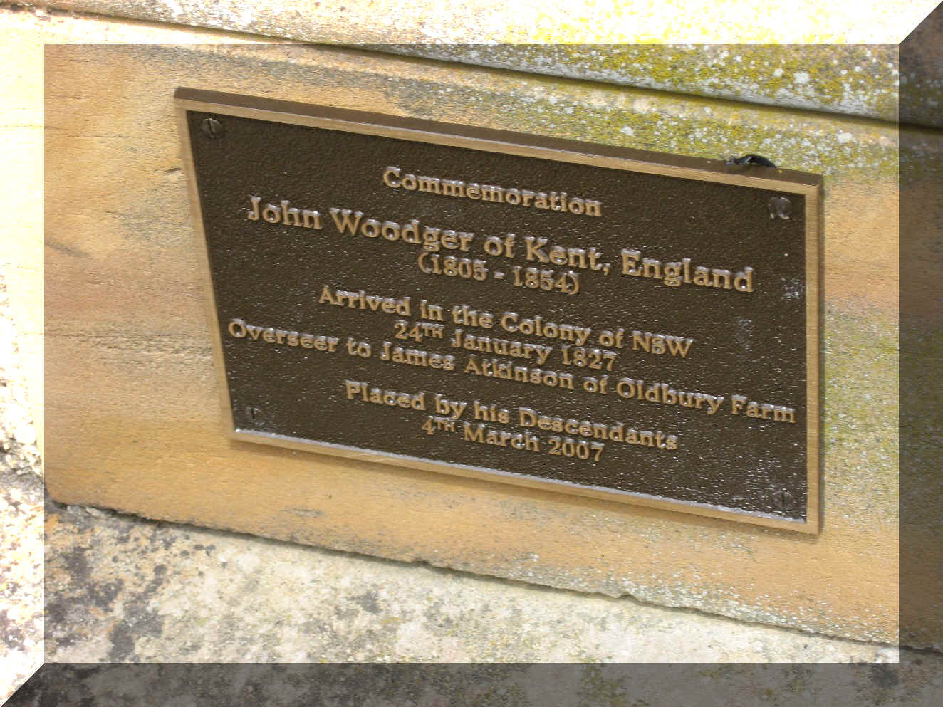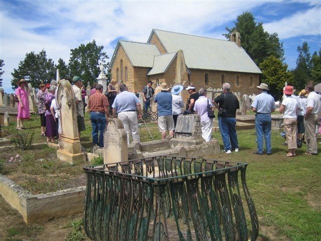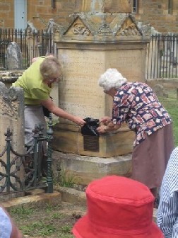 Sunday morning after some light rain saw the weather that had held the previous day return. We converged on All Saints, Sutton Forest to take part in the church service. This beautiful old sandstone church was full as we joined the congregation to take part in the service conducted by Rev. Cyril Turner. At its completion we made our way to the Woodger Family grave where Mary Anne Gourley made a short speech short noting that although the weekend was primarily for the descendants to gather and meet, some mark should be left for future generations. Mary Anne asked Jean Young the oldest descendant attending to unveil the commemoration plaque.
